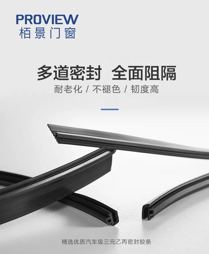 栢景系統(tǒng)門窗精選優(yōu)質(zhì)汽車級(jí)EPDM發(fā)泡膠條進(jìn)行密封,膠條是壓入式的;連接型材的隔熱條在同一條直線上,形成了一個(gè)完成的隔熱層(等溫線層),有效達(dá)到冬季保溫的效果。